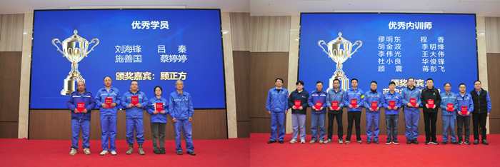 在結(jié)業(yè)儀式上,4名優(yōu)秀學(xué)員代表分別結(jié)合自身參與的《揚子江造船解決方案》(YSS 2.0)、電子化廠圖等課題,分享了數(shù)字化轉(zhuǎn)型實踐中的經(jīng)驗與感悟。2025年集團(tuán)內(nèi)訓(xùn)師全年授課量達(dá)732課時,培訓(xùn)人次超2.5萬,其中安環(huán)條線人均授課17課時,生產(chǎn)條線人均14課時,展現(xiàn)了內(nèi)訓(xùn)師團(tuán)隊的強(qiáng)大賦能能力。現(xiàn)場表彰了4名“智改數(shù)轉(zhuǎn)專項優(yōu)秀學(xué)員”和10名“優(yōu)秀內(nèi)訓(xùn)師”,公司領(lǐng)導(dǎo)為獲獎?wù)哳C發(fā)證書及獎金。