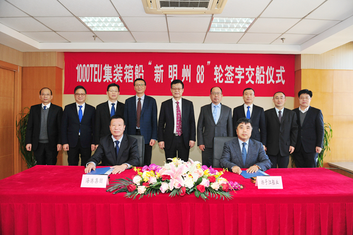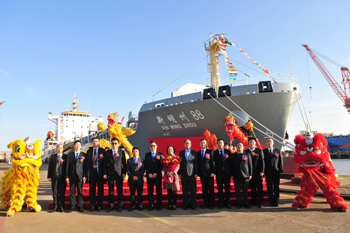 11月22日下午,我集團(tuán)為浙江海港集團(tuán)、寧波遠(yuǎn)洋建造的首制1000TEU集裝箱船“新明州88”輪命名交付。
