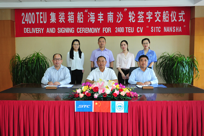 海豐航運集團副總裁肖森元先生,我集團副總經理杜成忠先生,副總經理張濤先生分別代表各方簽署交船文件。“SITC NANSHA”輪計劃8月14號開啟首航。