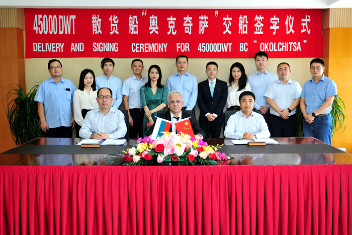 當(dāng)日下午,在各方代表的共同見(jiàn)證下,船東公司新造船經(jīng)理Dimitar Tonev先生,我集團(tuán)副總經(jīng)理杜成忠先生、副總經(jīng)理張濤先生分別代表雙方簽署交船文件,NAVIBULGAR 45000DWT散貨船“OKOLCHITSA”輪順利交付?!癘KOLCHITSA”輪計(jì)劃將于19日上午開(kāi)航,前往韓國(guó)接收第一批貨物。隨著“OKOLCHITSA”輪的交付,我公司為保加利亞船東NAVIBULGAR建造的六艘45000DWT散貨船項(xiàng)目完美收官。本項(xiàng)目由中國(guó)出口信用保險(xiǎn)公司提供出口信用擔(dān)保,中國(guó)進(jìn)出口銀行提供融資支持,兩方為項(xiàng)目順利推進(jìn)發(fā)揮了重要作用。
