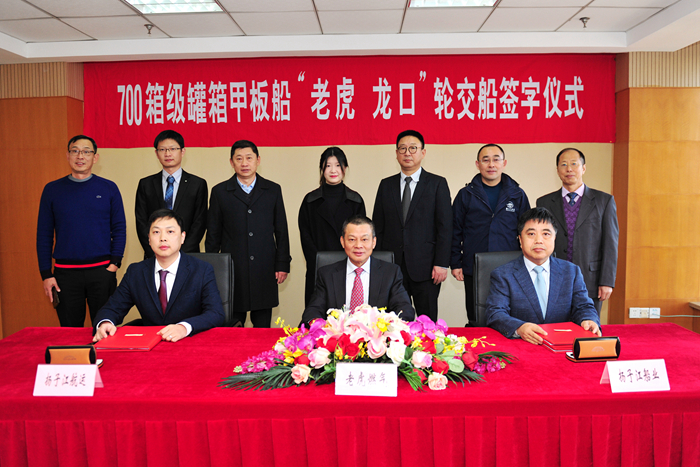 1月6日,我集團(tuán)與老虎燃?xì)饴?lián)合研發(fā),由新?lián)P子造船建造的集團(tuán)首制700箱級(jí)罐箱甲板船“TIGER LONGKOU”輪順利交付。老虎燃?xì)舛麻L薛朝春先生,我集團(tuán)副總經(jīng)理杜成忠先生,揚(yáng)子江航運(yùn)公司財(cái)務(wù)總監(jiān)孫劍平先生分別代表各方簽署交船文件。老虎燃?xì)猓ㄉ虾#┯邢薰究偛迷S俊峰先生,中船動(dòng)力副總經(jīng)理張仲領(lǐng)先生,我集團(tuán)總經(jīng)理助理吉宏飛先生以及中國船級(jí)社駐廠辦等多方嘉賓共同見證新船交付。
