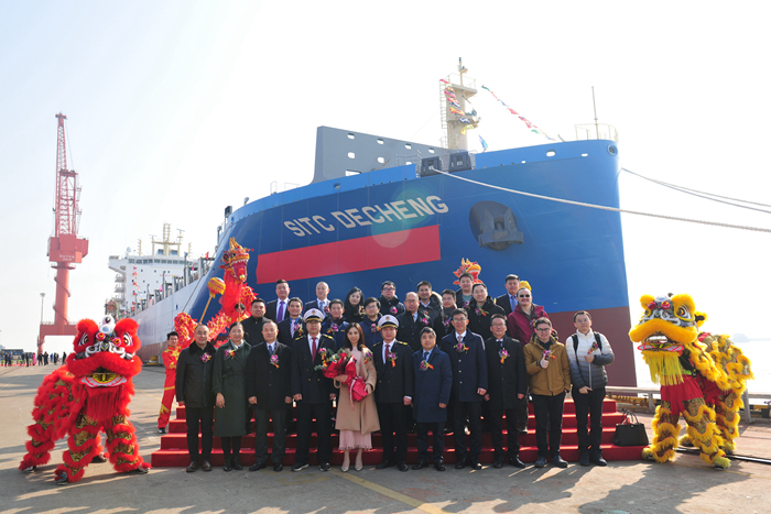 1月12日,新?lián)P子造船為海豐國際建造的第七艘2400TEU集裝箱船“SITC DECHENG”輪命名交付。海豐國際執(zhí)行董事、海豐航運集團總裁薛明元先生,我集團副總經(jīng)理杜成忠先生、副總經(jīng)理張濤先生、副總經(jīng)理周科偉先生以及海豐國際部分投資者代表共同出席了該儀式。