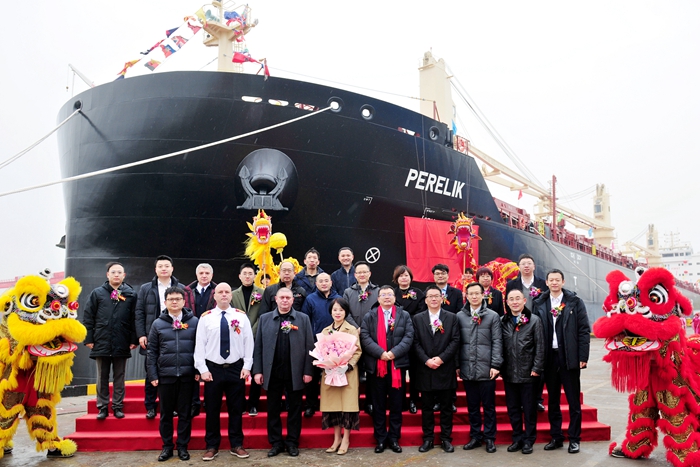 命名人郁紅女士將新船命名為 “PERELIK”(佩雷利克)輪,并為新船敲香檳祈福。她祝福新船揚(yáng)帆遠(yuǎn)航、載譽(yù)全球,祝愿隨船船員乘風(fēng)破浪、一路平安,開(kāi)辟遠(yuǎn)航新篇章。按照船東公司以保加利亞山脈和山峰為新船命名的慣例, “PERELIK”輪船名取自位于羅多普山脈的一座山峰。