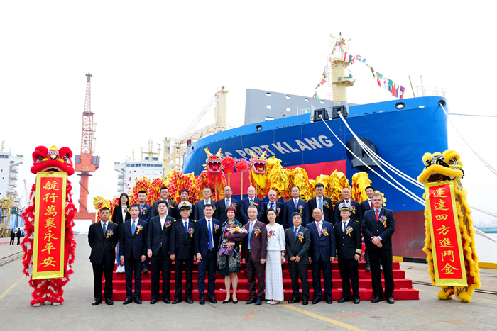 海豐國(guó)際董事局副主席兼首席執(zhí)行官楊現(xiàn)祥先生將新船命名為“SITC PORT KLANG”(海豐巴生)輪。教母劉嵐女士成功為“SITC PORT KLANG”(海豐巴生)輪砍纜,并為新船拉響汽笛,祝福新船乘風(fēng)破浪,船員平安啟歸,順達(dá)貨滿。首任船長(zhǎng)鄭程、首任輪機(jī)長(zhǎng)蔣延和向嘉賓介紹了新船的性能特點(diǎn),并陪同參加儀式的嘉賓參觀新船。