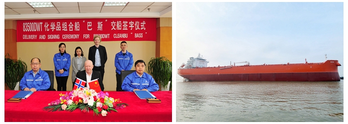 “BASS”輪是我司為挪威KLAVENESS公司建造的八艘系列船中的第七艘。3月25日,KLAVENESS公司駐新?lián)P子造船現(xiàn)場辦經(jīng)理特朗德·瑟蒙先生,我集團副總經(jīng)理杜成忠先生、副總經(jīng)理張濤先生分別代表各雙方簽署交船文件。KLAVENESS公司技術(shù)經(jīng)理安德里亞斯·哈維克先生參加簽字交船儀式。3月30日,83500DWT化學(xué)品組合船“BASS”輪從新?lián)P子碼頭出發(fā),開啟首航。