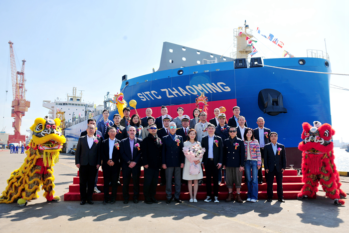 交船當(dāng)日,揚(yáng)子江船業(yè)與海豐國際在新?lián)P子造船隆重舉行了2600TEU集裝箱船“SITC ZHAOMING”(海豐昭明)輪的命名儀式。海豐國際董事局主席楊紹鵬先生,長江商學(xué)院日本校友會成員,ABS船級社大中華地區(qū)總裁Paul Karam先生,我集團(tuán)董事長兼總經(jīng)理任樂天先生,副總經(jīng)理杜成忠先生、副總經(jīng)理張濤先生以及各相關(guān)方的領(lǐng)導(dǎo)和嘉賓共同出席了命名儀式。長江商學(xué)院日本校友會執(zhí)行會長、上海誠美化妝品有限公司董事長、日本誠則至美研究院株式會社董事長鐘方盛先生為船舶命名。新船教母,長江商學(xué)院校友事務(wù)部、日本校友會分管負(fù)責(zé)老師賽婧女士砍纜并擲香檳禮,拉響汽笛,祝福新船揚(yáng)帆萬里,平安啟歸,班班滿載。