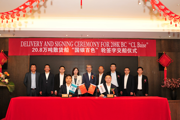 ▲當(dāng)日,在各方代表的共同見證下,國銀租賃船舶事業(yè)部副總經(jīng)理劉玉貫先生,我集團(tuán)副總經(jīng)理杜成忠先生,分別代表雙方簽署交船文件。4月24日,“CL BAISE”輪離開船廠碼頭,開啟首航。