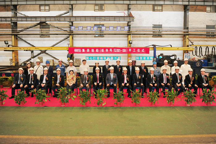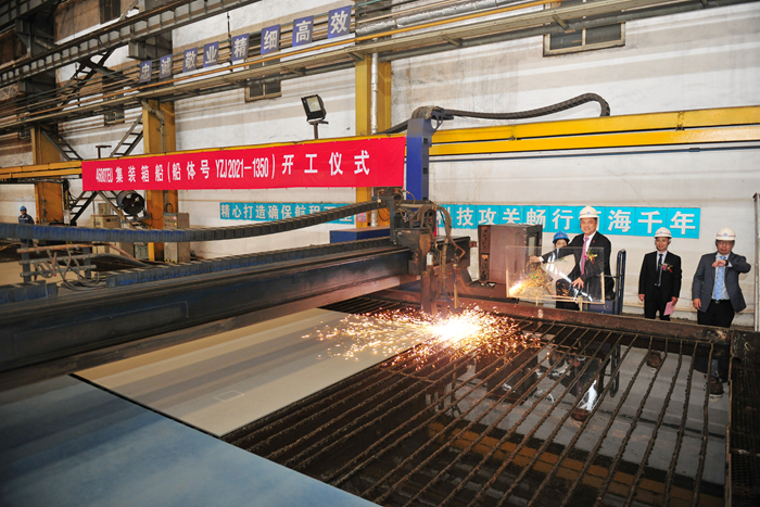 5月10日上午11時18分,隨著中谷海運集團夏國慶副總裁按下點火啟動按鈕,我集團承建的中谷物流10艘4600TEU集裝箱船在新?lián)P子造船加工車間順利開工。