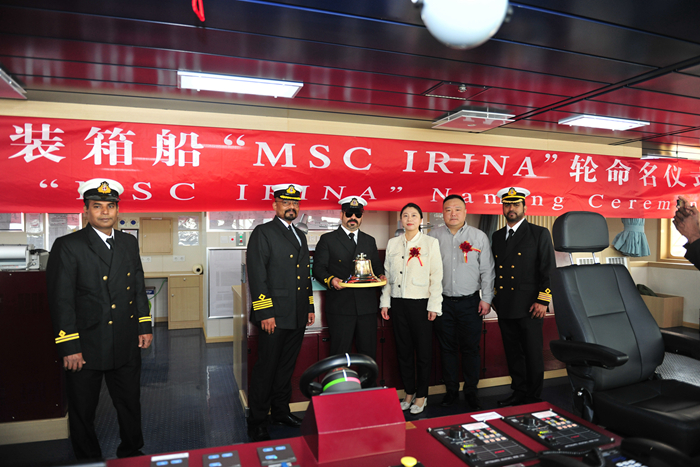 3月9日上午,新船命名人崔佳梅女士,地中海航運公司新造船中國區(qū)經(jīng)理CH Giuseppe Gargiulo先生,我集團總經(jīng)理助理兼揚子鑫福造船總經(jīng)理楊雪彥先生,以及來自DNV船級社、船東現(xiàn)場監(jiān)造組、船廠方相關部門的領導和嘉賓共同見證。崔佳梅女士將新船命名為“MSC IRINA”輪,為新船砍纜并擲香檳禮,拉響汽笛。CH Giuseppe Gargiulo先生與崔佳梅女士為新船送上寄語,祝福新船揚帆萬里,順風順水,平安啟歸,班班滿載,為各方帶來榮譽和財富。
