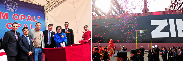 蔡霞女士將新船命名為“ZIM OPAL”輪,為新船砍纜并擲香檳禮,拉響汽笛,祝福新船、隨船船員航行平安,為船東和租家?guī)順s譽(yù)和財(cái)富。在“ZIM OPAL”輪首任船長(zhǎng)的陪同下,參加儀式的嘉賓興致勃勃地登船參觀。