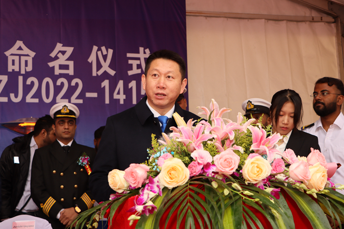 宋書明先生代表船廠致辭,他表示:“該首制船含春節(jié)建造周期約10個(gè)月,在此過程中,船東、船級(jí)社和船廠都致力于建造一艘優(yōu)質(zhì)高性能船舶,堅(jiān)信在各方的共同努力下,后續(xù)系列船舶會(huì)有更出色的表現(xiàn)。今天,終于迎來為該船命名的重要時(shí)刻。感謝船東現(xiàn)場(chǎng)團(tuán)隊(duì)和DNV驗(yàn)船師的支持和幫助以及參與該船建造的揚(yáng)子三井造船員工的不懈努力。讓我們繼續(xù)與船東和船級(jí)社緊密合作,為建造更安全、更環(huán)保、更具國(guó)際競(jìng)爭(zhēng)力的船舶而努力。我們將按照船東和全球市場(chǎng)的需求,用心打造每一艘船?!?/p>