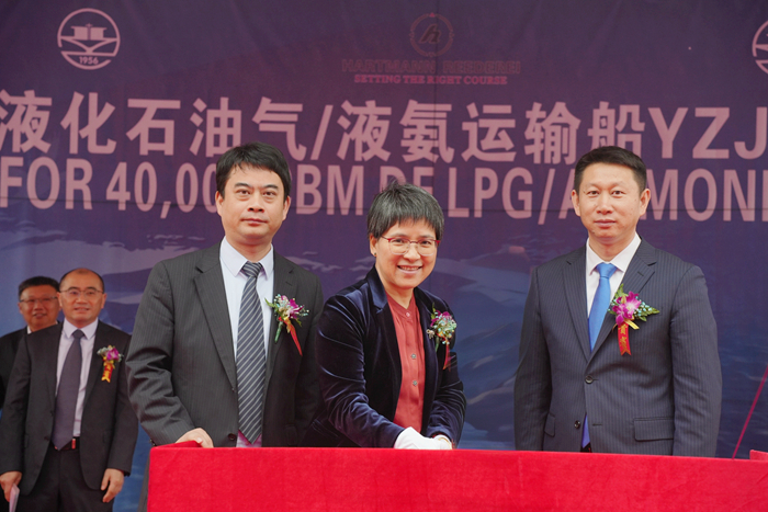 儀式上,揚子三井代表宋書明先生表示:今天我們共同迎來了Hartmann第二艘4萬立方米雙燃料液化石油氣/液氨運輸船命名交付的歡慶時刻,首先感謝教母倪衛(wèi)芳女士撥冗出席為本船命名。特別感謝Hartmann團隊的幫助和支持,感謝與我們密切合作的DNV船級社,感謝每一位為本船作出貢獻的揚子三井員工。