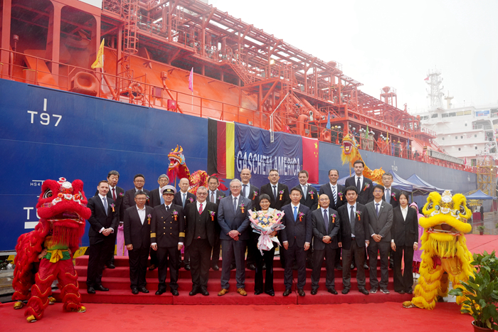 4月12日,揚子三井為德國HARTMANN建造的第二艘4萬立方米雙燃料液化石油氣/液氨運輸船“GASCHEM AMERICA”輪(掛利比里亞旗)順利簽字交付。HARTMANN董事會執(zhí)行總監(jiān)Ulrich Adami先生、我集團副總經理兼揚子三井總經理宋書明先生、揚子三井總經理助理中尾慎一先生代表簽署了交船文件。