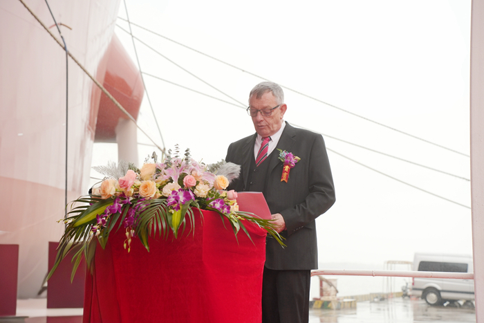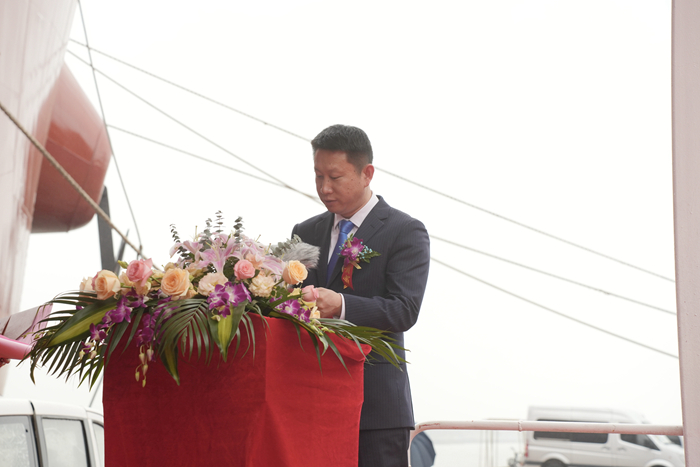 教母中信銀行蘇州分行副行長倪衛(wèi)芳女士,HARTMANN董事會執(zhí)行總監(jiān)Ulrich Adami先生、董事會商務總監(jiān)Jan-Lars Kruse先生、新造船經理Ionut Cornea先生、大中華區(qū)區(qū)域經理龍葉飛先生,DNV船級社江陰站經理史勇林先生,中信銀行太倉分行行長顧衛(wèi)先生,三井物產上海井上伸一先生、住田直也先生、田野先生,揚子江船業(yè)集團副總經理丁建文先生,集團副總經理兼揚子三井總經理宋書明先生,揚子三井CFO石丸雄次先生、COO田村光路先生、副總經理陳國強先生及總經理助理中尾慎一先生以及各合作方、員工等代表參加了命名交船儀式。