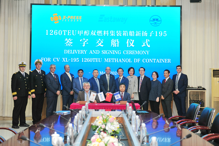 5月16日上午,我集團新?lián)P子造船為船東新加坡 X-Press Feeders公司建造的首制1260TEU甲醇雙燃料集裝箱船簽字交付。該型甲醇雙燃料集裝箱船由中國船舶及海洋工程設(shè)計研究院(MARIC)聯(lián)合德國知名設(shè)計公司共同設(shè)計優(yōu)化,是一艘裝箱量可達1260TEU的敞口支線集裝箱船,能夠裝載4種不同尺寸的集裝箱。