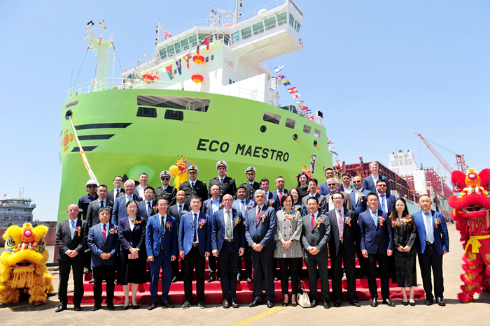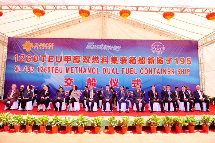 5月16日,我集團與X-Press Feeders公司共同為新船舉行了隆重的交船儀式。X-Press Feeders公司首席執(zhí)行官Shmuel Yoskovitz先生、首席運營官Francis Goh先生、首席商務(wù)官Steffanie Sim女士,DNV船級社全球副總裁兼中國技術(shù)中心總經(jīng)理Pettersen Oyvind先生,DNV船級社中國北方區(qū)總經(jīng)理晏曉琳女士,中國船舶及海洋工程設(shè)計研究院(MARIC)副所長朱建璋先生,我集團董事長任樂天先生,集團副總經(jīng)理兼新?lián)P子造船總經(jīng)理杜成忠先生、集團副總經(jīng)理周科偉先生,集團副總經(jīng)理吉宏飛先生,以及船東現(xiàn)場監(jiān)造組、船級社監(jiān)造組、項目合作相關(guān)方、船廠建造代表等領(lǐng)導(dǎo)和嘉賓出席了儀式。