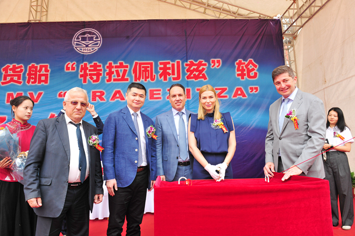 Dani Domuschieva女士將新船命名為“TRAPEZITZA”輪,并擲香檳禮。鞭炮、禮花齊響,汽笛共鳴,龍獅共舞。祝福新船、隨船船員航行平安,為建造方帶來榮譽,為船東帶來好運與財富。嘉賓們齊聚船艏合影留念,并在船長的陪同下登船參觀。